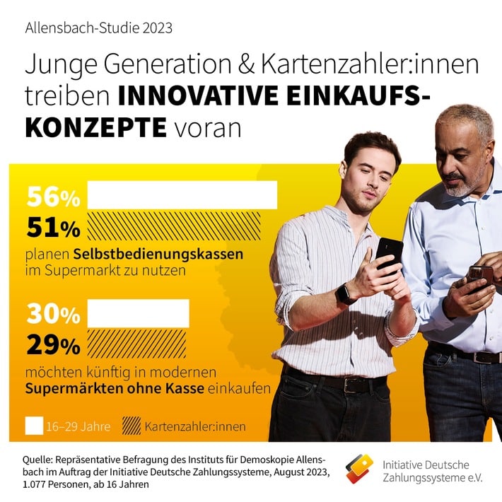 Der Einkauf an der klassischen Ladenkasse ist heute eigentlich nicht mehr zwingend notwendig. Dafür sorgen neuartige Ladenkonzepte, Selbstbedienungskassen oder Lieferdienste. Aber die Deutschen sind, was ihre Einkäufe betrifft, aktuell noch sehr traditionell eingestellt: Der Großteil der Bevölkerung (90 Prozent) entscheidet sich noch immer für den gewohnten Einkauf an der Supermarktkasse mit Personal. Gerade für Kartenzahler:innen und die junge Generation gehören innovative Konzepte aber klar zum Einkaufsmodell der Zukunft: Jede:r Zweite möchte künftig verstärkt an modernen Selbstbedienungskassen einkaufen. Diese und weitere spannende Erkenntnisse, liefert der Rückblick auf das Jahr 2023 aus der jährlichen Umfrage des Instituts für Demoskopie Allensbach (IfD) im Auftrag der Initiative Deutsche Zahlungssysteme e.V.