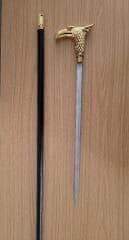 Bei genauerer Inaugenscheinnahme konnte der Beamte feststellen, dass sich der goldene Kopf drehen lies und ein ca. 44 cm langer (Klingenlänge) Degen (sieh Bild) zum Vorschein kam. Da es sich bei diesem sogenannten „Stockdegen“ um eine verbotene Waffe handelt, die einen harmlosen Alltagsgegenstand vortäuscht, stellt dies ein Gesetzesverstoß da.