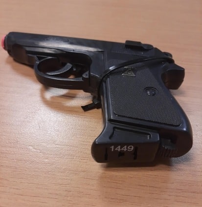 Die Bundespolizisten konnten die Waffe an sich bringen und legten dem Franzosen Handschellen an. Die Polizisten konnte dann feststellen, dass es sich um eine Spielzeugwaffe handelte (siehe Bild).