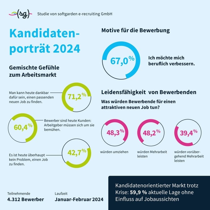 Zwei Drittel der Jobsuchenden präsentieren sich auch im Krisenjahr 2024 auf dem Arbeitsmarkt, weil sie sich beruflich verbessern möchten. Auf der Verbesserungsliste der Kandidaten weit oben stehen dabei aktuell vor allem Karrieremöglichkeiten sowie Arbeitsinhalte und -kultur. Das zeigt eine aktuelle softgarden-Umfrage unter 4.312 Bewerbenden.