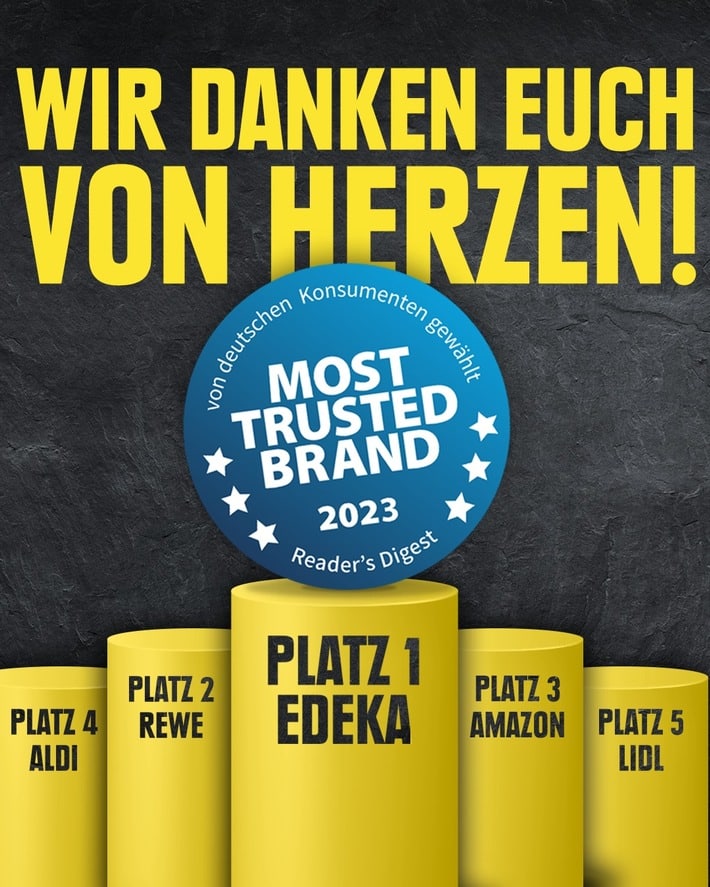Angesichts der andauernden Inflation ist Verbraucher:innen ein attraktives Preis-Leistungs-Verhältnis, aber auch die Verfügbarkeit von Lebensmitteln besonders wichtig. Bei EDEKA können die Kund:innen jederzeit auf eine große Produktvielfalt und wettbewerbsfähige Preise vertrauen. Die Auszeichnung als vertrauenswürdigste Händlermarke ist ein weiterer Beweis für die gelebte Kund:innennähe und die Lebensmittelkompetenz von EDEKA. Besonders gut schneiden die EDEKA-Märkte bei der Qualität der Produkte, einem sehr kundenorientierten Service und einer guten Reputation ab. Das Unternehmen liegt im diesjährigen Ranking vor allen anderen deutschen Lebensmitteleinzelhändlern: Auf den weiteren Plätzen folgen die Unternehmen REWE, Amazon, Aldi, Lidl und Kaufland. Markus Mosa betont: „Jahr für Jahr schenken unsere Kundinnen und Kunden uns ihr Vertrauen. Das motiviert uns immer wieder aufs Neue zu Höchstleistungen!“