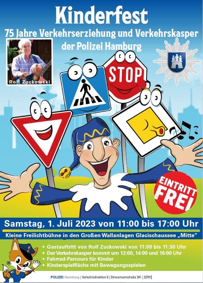 Mit dem vergnüglichen Fest für die jungen Verkehrsteilnehmenden, Eltern, Begleitpersonen und Interessierten möchte die Polizei Hamburg dieses Jubiläum feiern. Neben dem Auftritt des Hamburger Liedermachers Rolf Zuckowski in der Zeit von 11:00 Uhr bis 11:30 Uhr gehören unter anderem ein Fahrradparcours und der Auftritt des Verkehrskaspers (12:00 Uhr, 14:00 Uhr und 16:00 Uhr) zum Programm.
