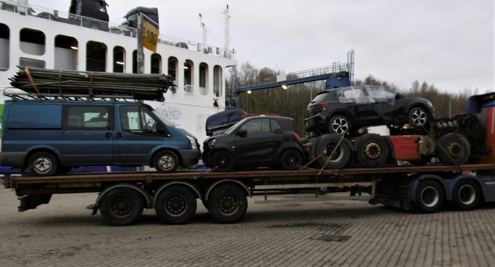 Gegen 08:00 Uhr bat ein Verantwortlicher einer Fähre um polizeiliche Unterstützung. Die flachen Ladeflächen zweier Anhänger waren mit Schrott und Gebrauchtwagen beladen. Er beanstandete zum einen die unzureichende Sicherung der Ladung und zum anderen das Austreten von Betriebsstoffen.