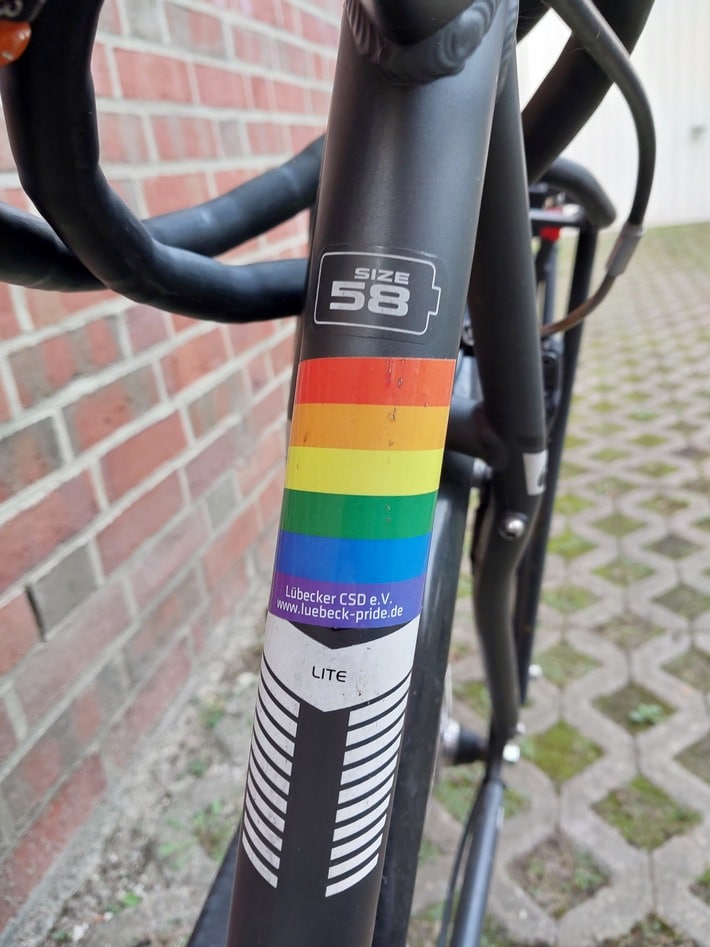 Besonders auffällig sind der montierte Triathlon Lenker und drei Aufkleber in Regenbogenfarbe mit der Aufschrift „Lübecker CSD e. V.“.