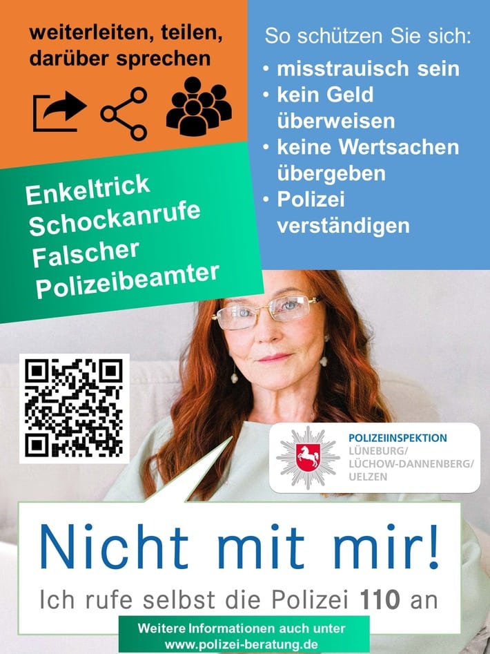 Mit der Aufforderung „Weiterleiten, teilen und darüber sprechen!“ möchte die Polizei auch flankierend zu den klassischen und sozialen Medien zu weiteren Zielgruppen vordringen und damit die Präventionskampagne zum Seniorenbetrug verstärken.
