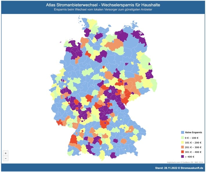 „Noch vor ein paar Wochen war es in fast ganz Deutschland so, dass die Grundversorgungstarife die günstigsten Tarife am Markt waren und es für Verbraucher keine attraktiven Wechseloptionen gab. Das hat sich durch die zahlreichen Preiserhöhungen der Grundversorger jetzt wieder geändert, wie die Karte mit der Wechselersparnis vom 28.11.2022 zeigt“, sagt Dr. Jörg Heidjann, Energieexperte vom Vergleichsportal StromAuskunft.
