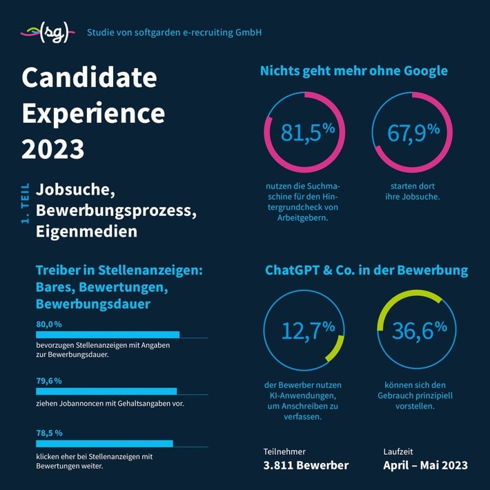 Die Studie „Candidate Experience 2023“ veröffentlicht softgarden in zwei Teilen. Das Whitepaper zum ersten Teil steht ab sofort zum kostenlosen Download zur Verfügung: go.softgarden.com/candidate-experience-2023 (https://hr-praesenz.epaper.mt/?nltr=MTY1OzA7aHR0cHM6Ly9nby5zb2Z0Z2FyZGVuLmNvbS9jYW5kaWRhdGUtZXhwZXJpZW5jZS0yMDIzOzszOTVlMWFlYzc4NzNhMDRiYWMzYmMzZjNiZDY3ZTU2Yg%3D%3D).