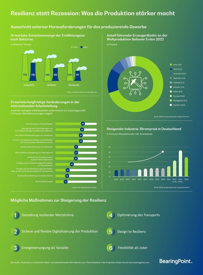 Das produzierende Gewerbe in Deutschland hatte in den vergangenen Jahren stark zu kämpfen – und die Krisen habenzuletzt noch weiter zugenommen: Pandemie, Konjunkturschwäche, Klimakrise, Fachkräftemangel, steigende Energiekosten, unsichere Energieversorgung, gestörte Lieferketten sowie vermehrte Cyberangriffe und geopolitische Entwicklungen. Die Industrie muss ihre CO2-Emissionen reduzieren, um den gesetzlichen Anforderungen und den Erwartungen von Kunden, Investoren und Mitarbeitenden gerecht zu werden – und darüber hinaus auf jüngste Entwicklungen reagieren, die sich ihrer direkten Einflussnahme entziehen und viele Ressourcen wie Zeit und Geld binden. Unternehmen müssen folglich krisenresistenter werden, um schnellstmöglich zur Vorkrisensituation zurückkehren zu können.