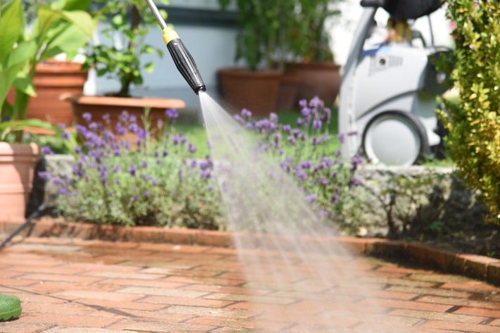 Um die zu reinigende Oberfläche zu schonen, ist die Wahl der richtigen Düse entscheidend. „Am besten eine verschmutzte Stelle erst mit etwas Abstand am Rand bearbeiten, um die Stärke des Hochdruckstrahls vorsichtig zu testen“, rät Julian Kroeber. So ist beispielsweise bei Pflastersteinen aus weichem Stein wie Kalkstein oder Marmor Vorsicht geboten, denn sie können durch den harten Wasserstrahl porös werden oder sogar brechen. Hartes Gesteinsmaterial wie Beton, Granit, Basalt oder Quarz sollte gebrannt sein.