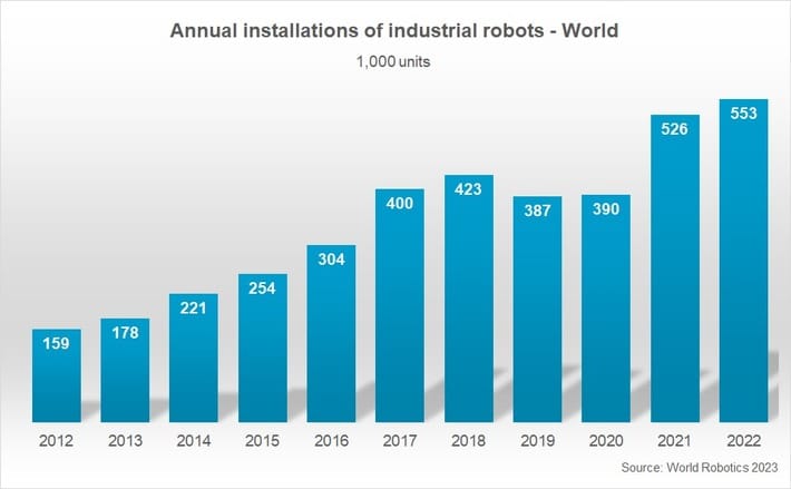 „Das zweite Jahr in Folge wurde die Rekordmarke von weltweit 500.000 neu installierten Einheiten übertroffen“, sagt Marina Bill, Präsidentin der International Federation of Robotics. „Im Jahr 2023 dürfte der globale Markt für Industrie-Roboter voraussichtlich um 7 % auf mehr als 590.000 Einheiten wachsen.“